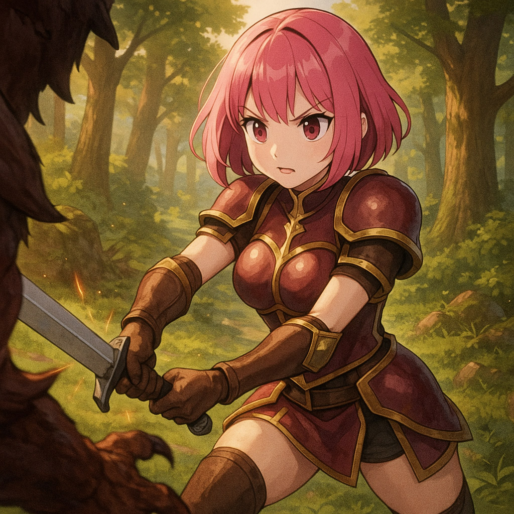 左の画像は2025年8月、8か月前に生成した「RPGケイコちゃん」です。(ネタです)森の中でモンスターと対峙しているのでしょうか?よくあるRPG設定なイラストになります。