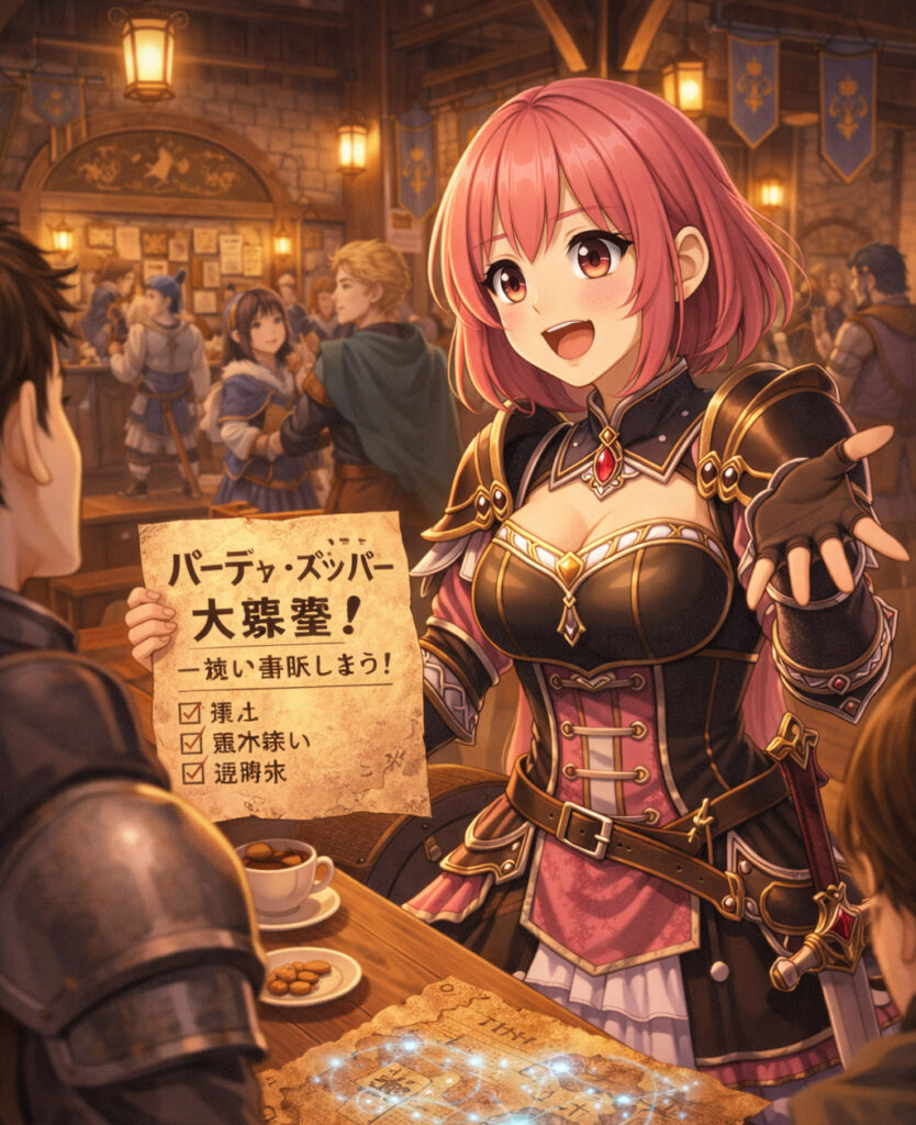 こちらは3か月前の2026年1月にGPT5.1で生成した「RPGケイコちゃん」です。ちょうどGeminiの大幅アップデート直後ですね。パーティーギルドのようなところで冒険者に対して紙を見せて勧誘していますが、GPTの苦手とするテキストの表現、文字が謎の漢字?になってしまうところに悩まされた方も多かったのではないでしょうか?ここでGeminiで生成に切り替えるユーザーも多かったことでしょう。