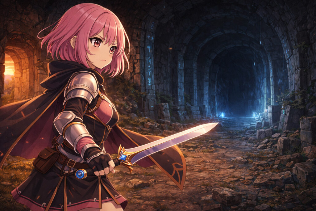 RPGケイコちゃんがダンジョンを探索する様子をシネマティックイラストで描いてください