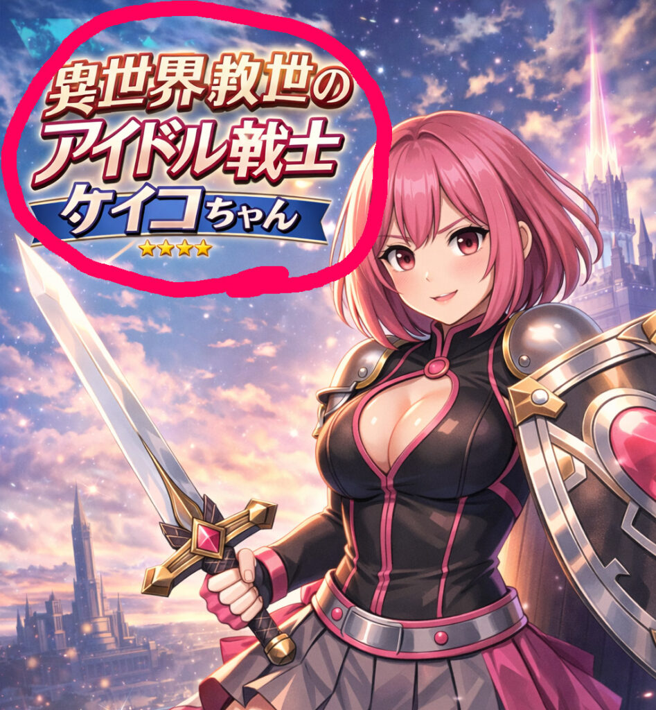 先ほどの生成したダンジョン画像に上記のプロンプトを入力しただけで、見事文字化けしないサムネ風タイトルができました!