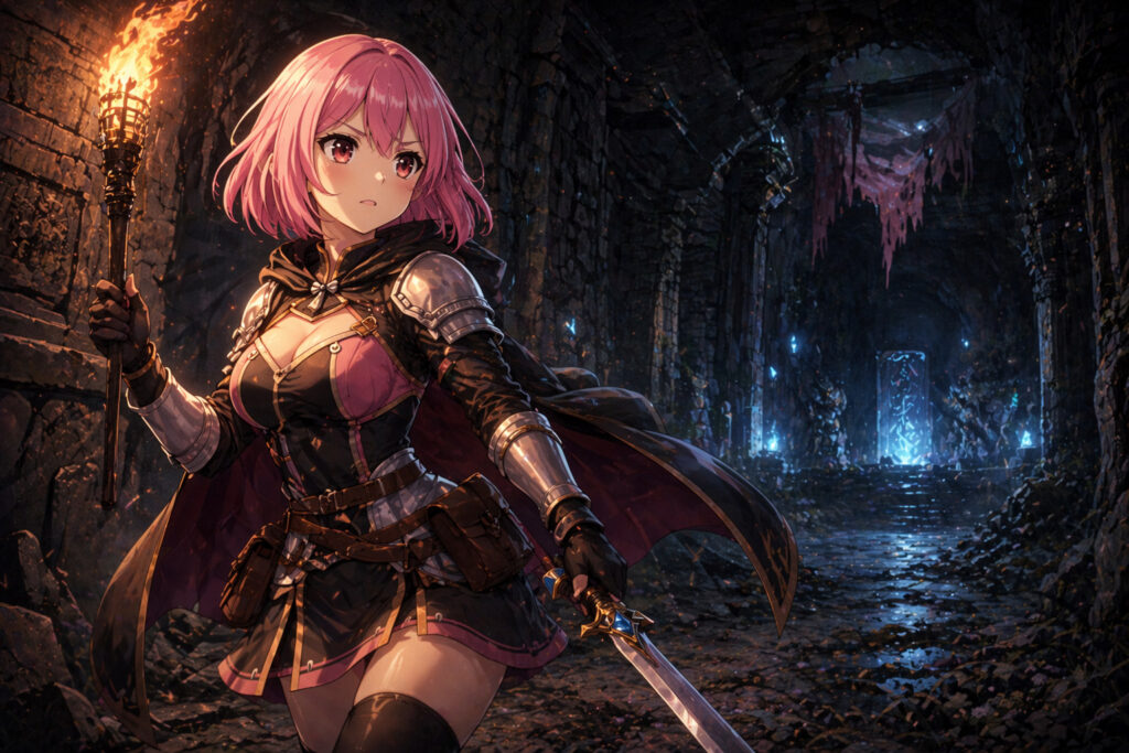 上記2つの画像はこの同じプロンプトで生成されています。(キャラクター設定自体はGPTに記憶させております)ダンジョンの中をRPGケイコちゃんが探索する様子なんですが、まず、わかるのは光の加減や背景の描画がより洗練されているというところにまず気づきます。より立体的なアニメ画像(ここではアニメイラストで)。たいまつの炎の揺れとか、ダンジョンの奥にある破れた垂れ幕のようなものも特にプロンプトでは指定していなく、上記の短い一文だけでこのクオリティです。