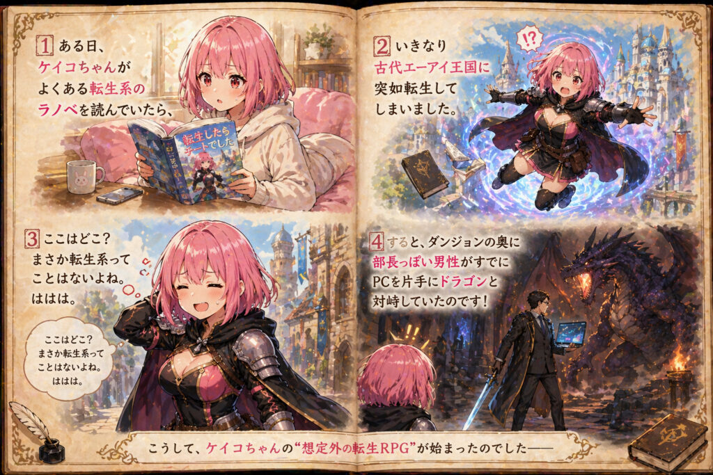 RPG風古紙に描かれた4コマの絵本を描いてください。ストーリーとしては、ある日ケイコちゃんがよくある転生系のラノベを読んでいたら、いきなり古代エーアイ王国に転生して、「ここはどこ?まさか転生系ってことはないよね。ははは。」と困惑したら、ダンジョンの奥で部長っぽい男性がPCを片手にドラゴンと対峙していた。