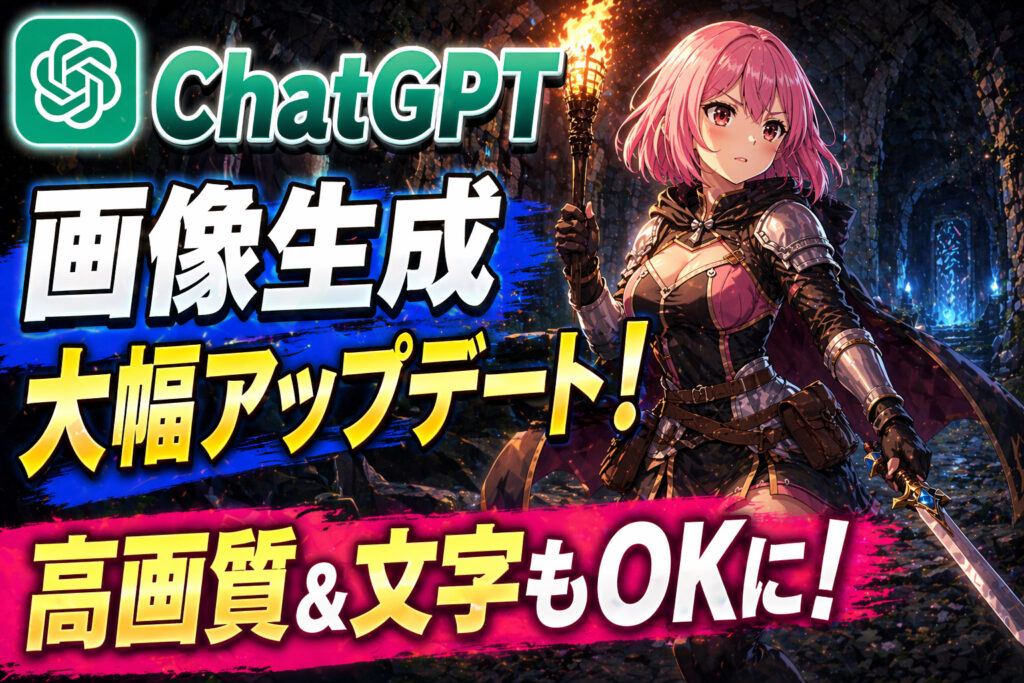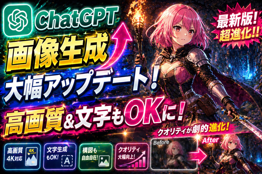 タイトルは「ChatGPT画像生成大幅アップデート!」「高画質&文字もOKに!」そして左上にChatGPTのロゴもいれましょう